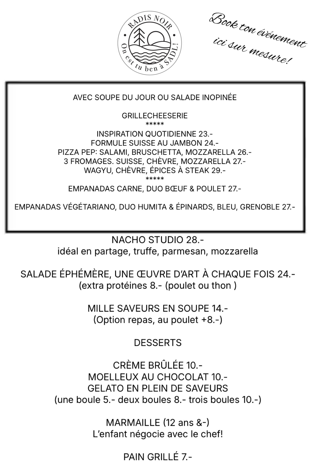 SVP, nous contactez au info@radisnoir.ca pour une réservation de groupe de 12 personnes et plus.