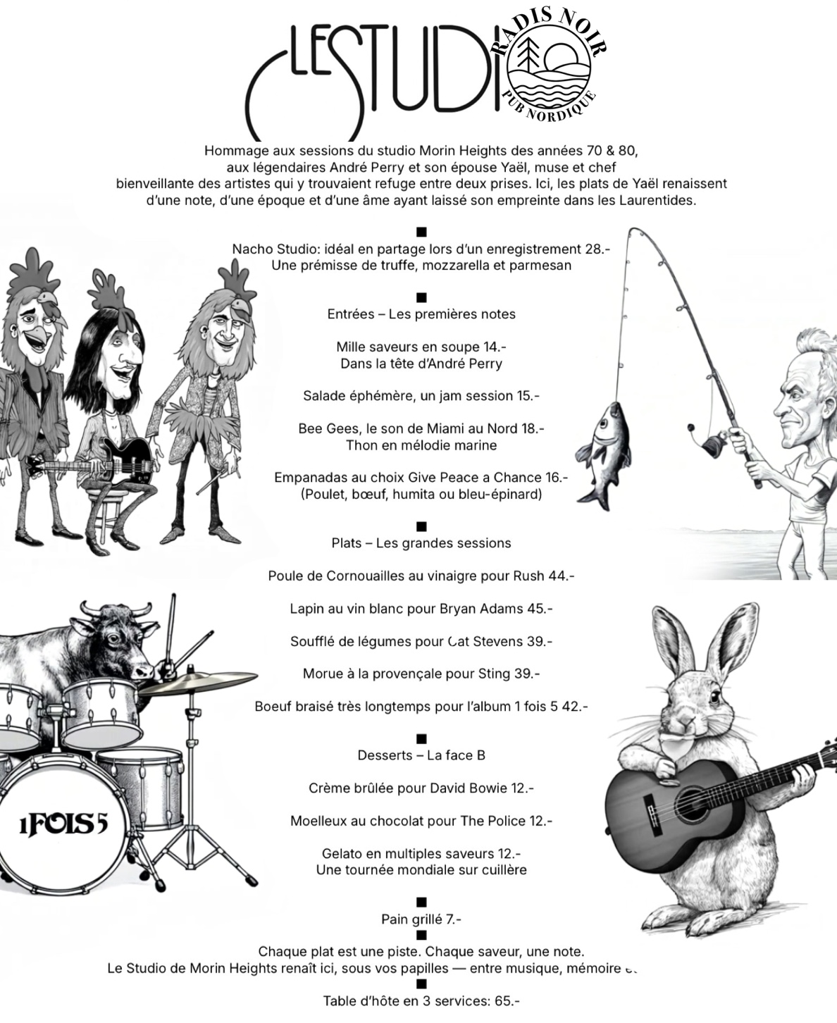 On est tu ben à SADL! À l’année, de 11h30 à tard dans la soirée, en groupe ou en intimité, Le Radis Noir, c’est l’endroit où se rassembler. Des moments festifs au pub, au son de la musique live ou des rires de nos soirées d’humour, venez rencontrer deux passionnés, Fred et Sylvain, professionnels créatifs de la restauration.